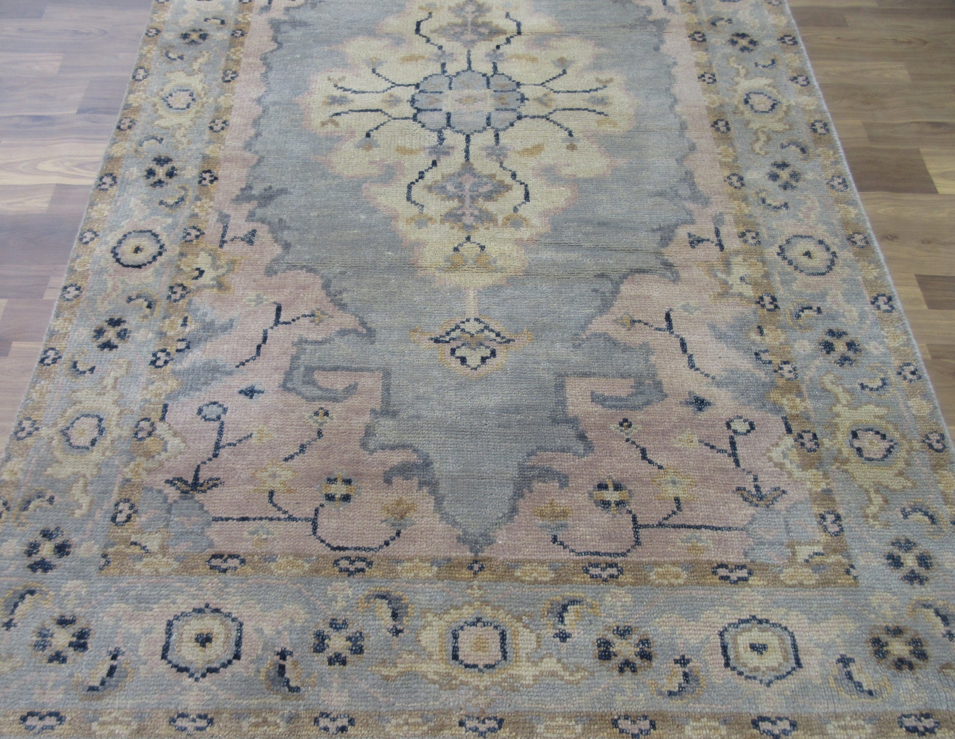 This vintage rug features a captivating blend of neutral tones with intricate floral and geometric patterns. The central medallion design and detailed border add a touch of elegance. This rug is 100% hand-knotted by expert artisans from the village, ensuring that it is not machine-made. It is a stunning, eye-catching piece of floor art that will elevate the beauty of your living space. The intricate design, vibrant colour concept, high-quality materials, and traditional hand-weaving process combine to create a décor element that you'll cherish every time you see it.