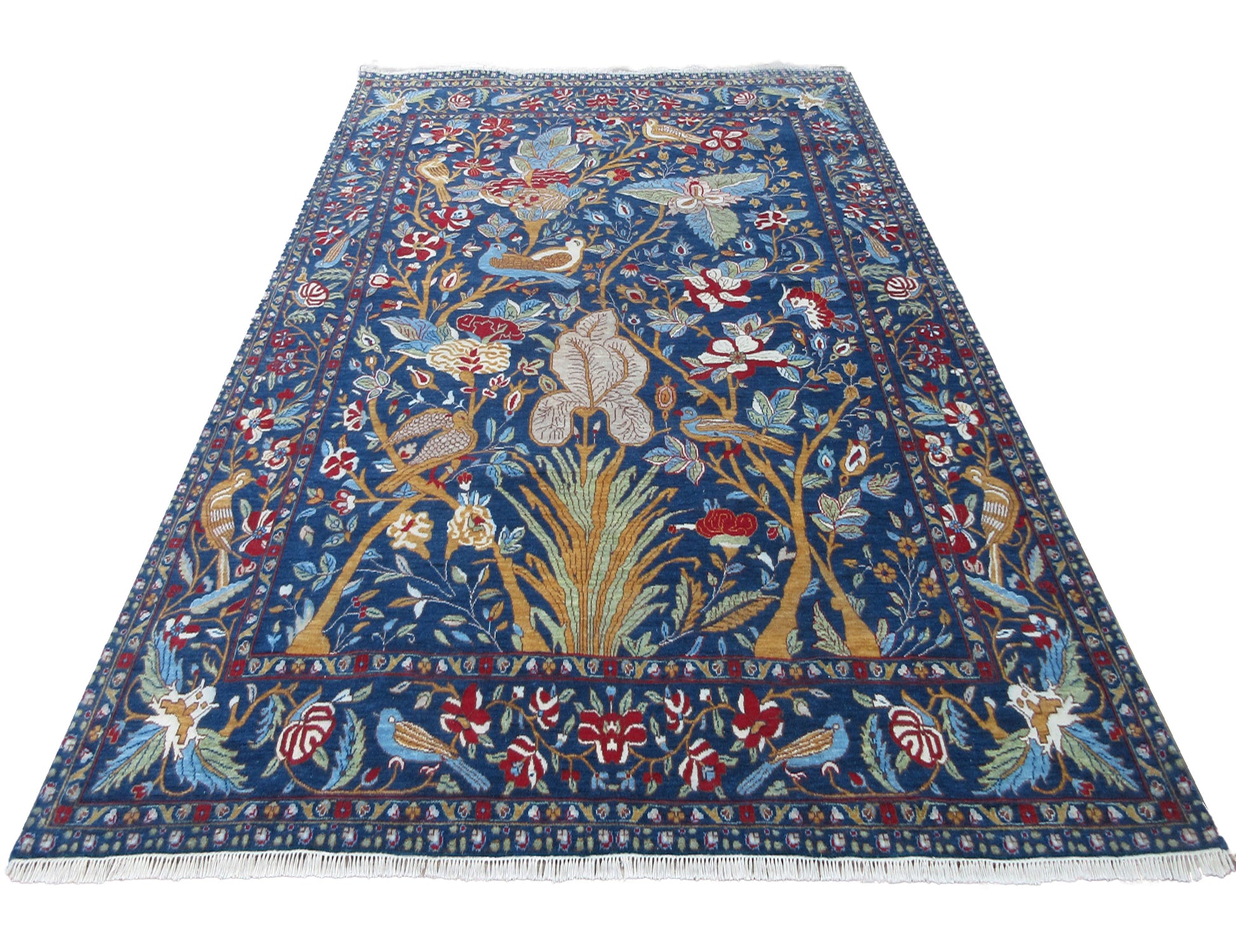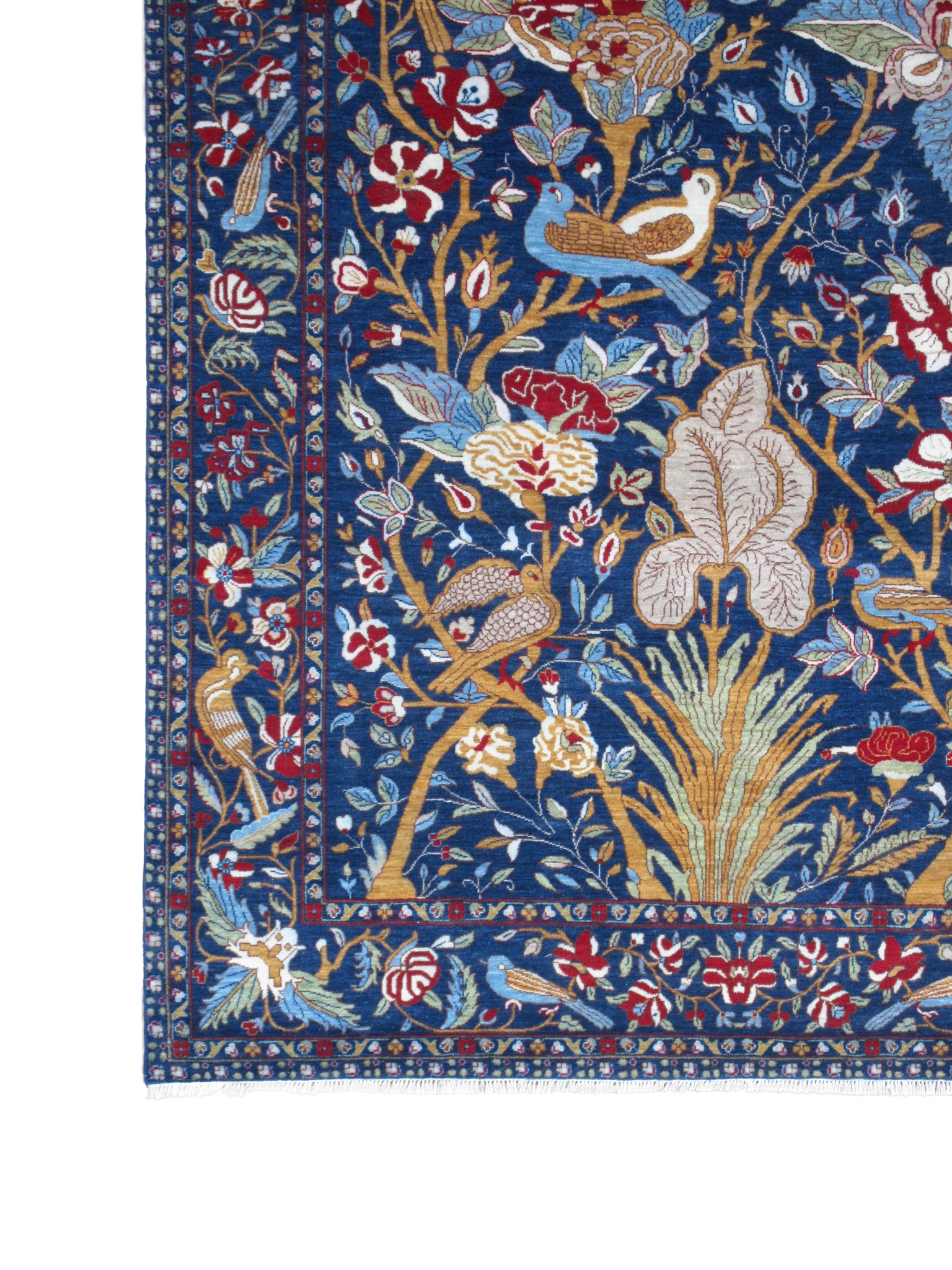 Contemporary Navy Blue Handmade Bird Hunting Wool Rug 8x10ft Modern & Elegant Bird Design