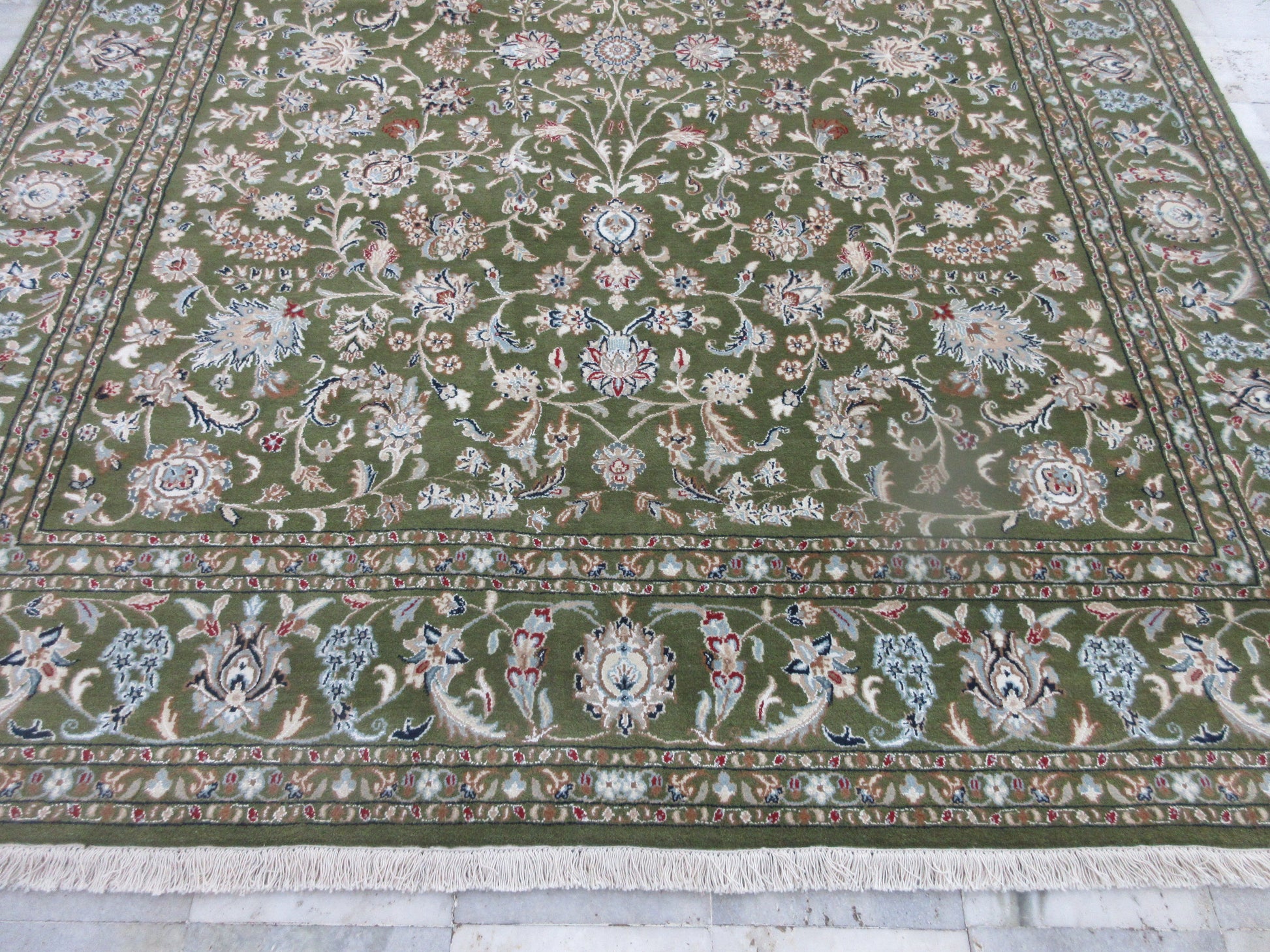 Hand-Knotted 8x10 ft Dark Green Floral Persian Style Rug | Silk Rug | Traditional Area Rug