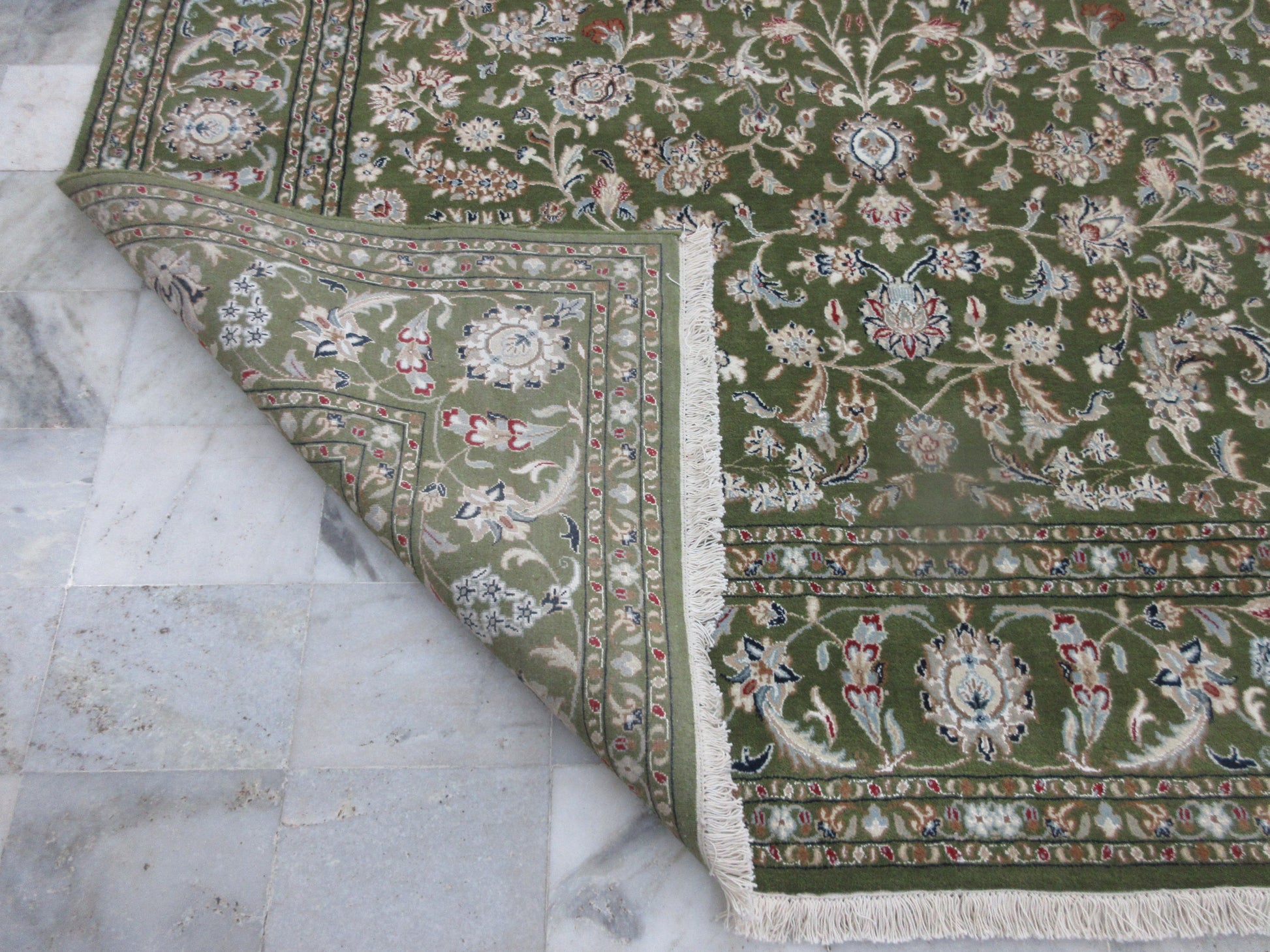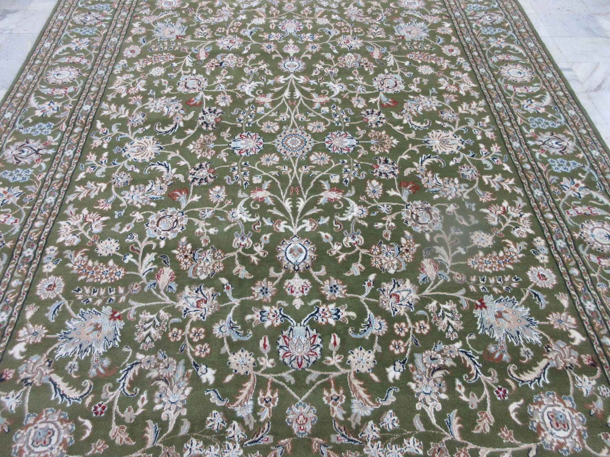 Handmade 8x10 ft dark green Persian-style rug, intricate floral pattern with traditional designs, Ideal for adding elegance to any living room. This rug is 100% hand-knotted by expert artisans from the village, ensuring that it is not machine-made. It is a stunning, eye-catching piece of floor art that will elevate the beauty of your living space. The intricate design, vibrant color concept, high-quality materials, and traditional hand-weaving process combine to create a décor element that you'll cherish every time you see it.