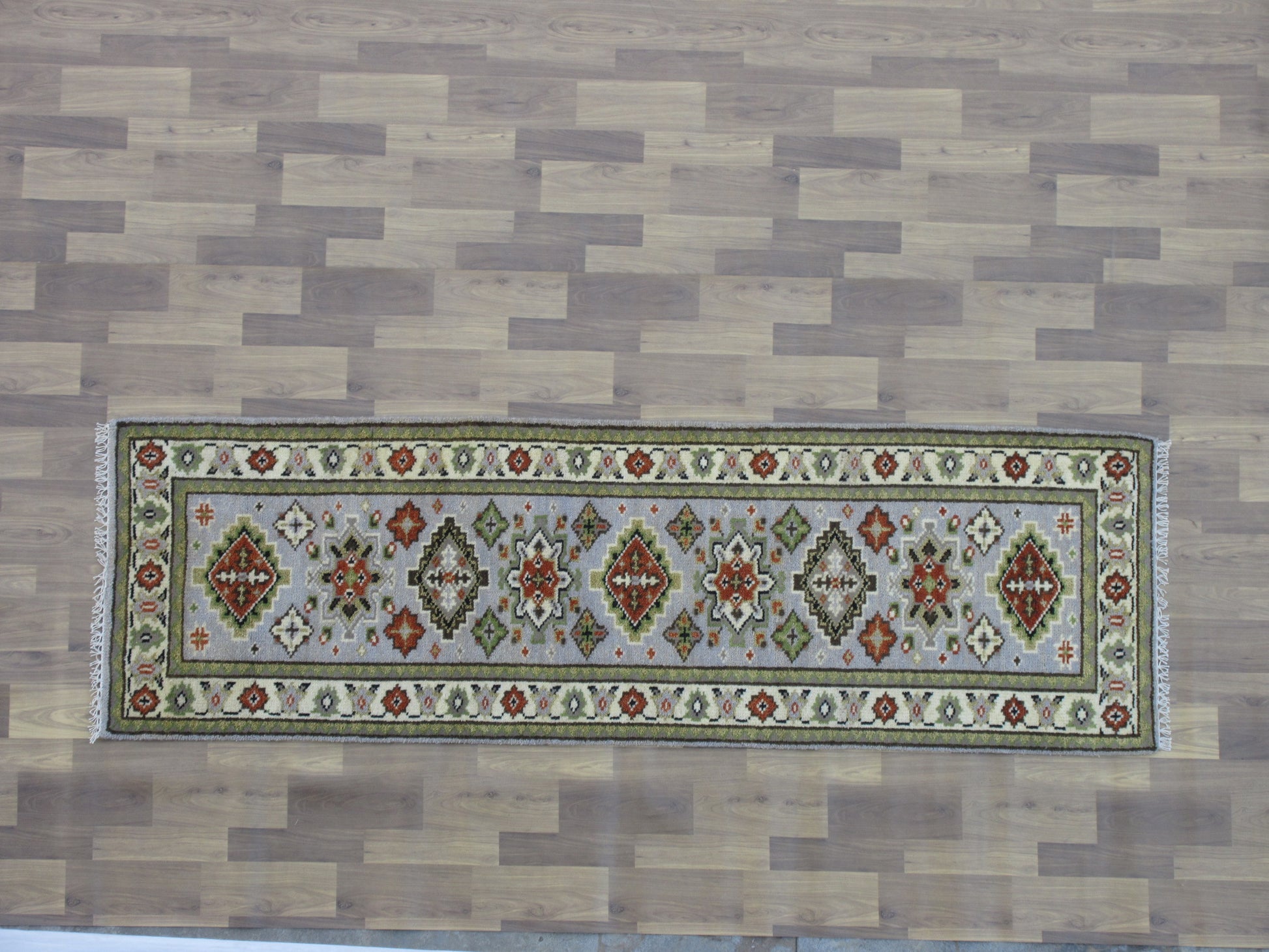 Hand Knotted Kazak Wool Rug 8x2.6ft Blue & Ivory Runner Bedroom Kitchen Carpet