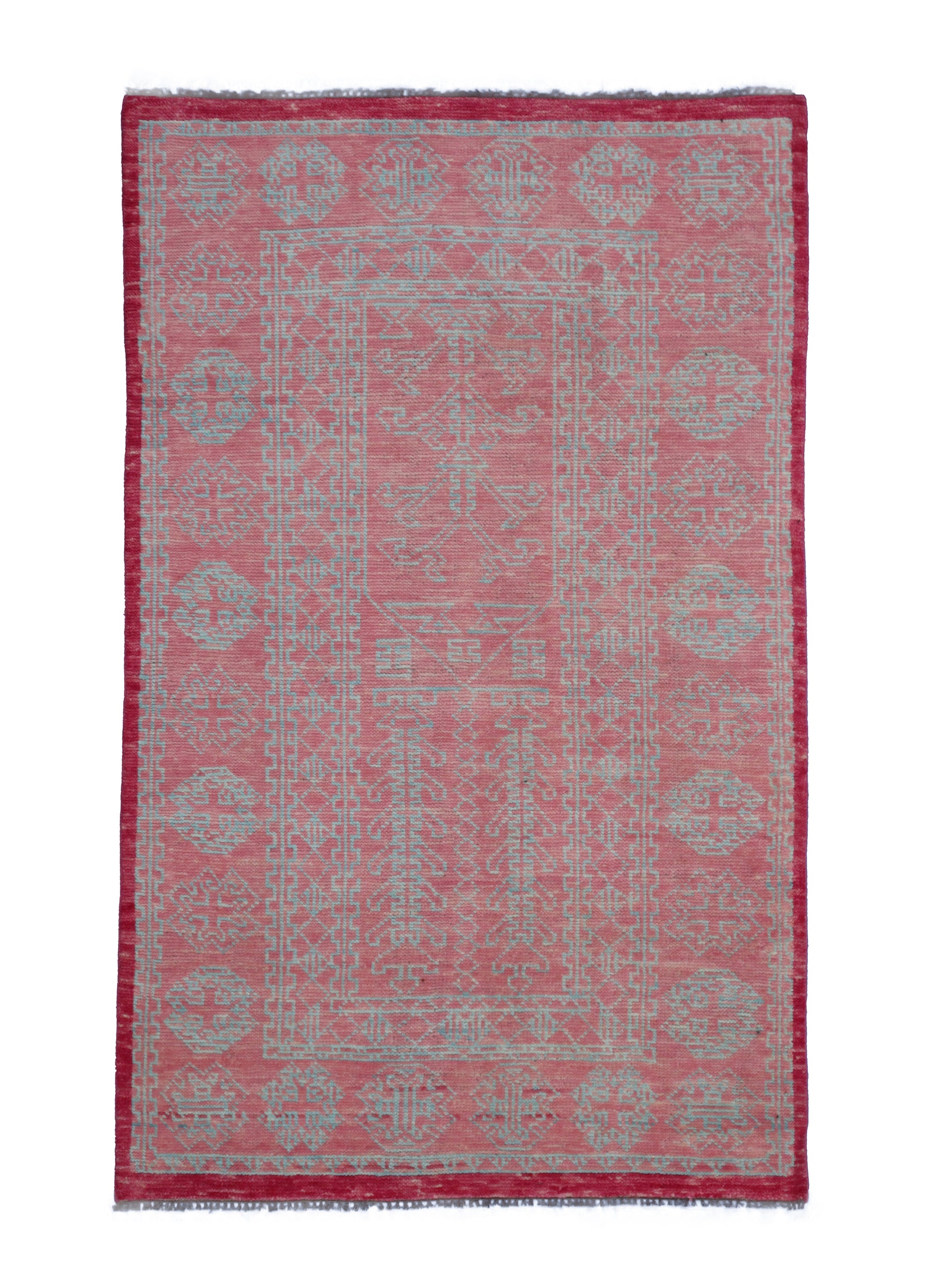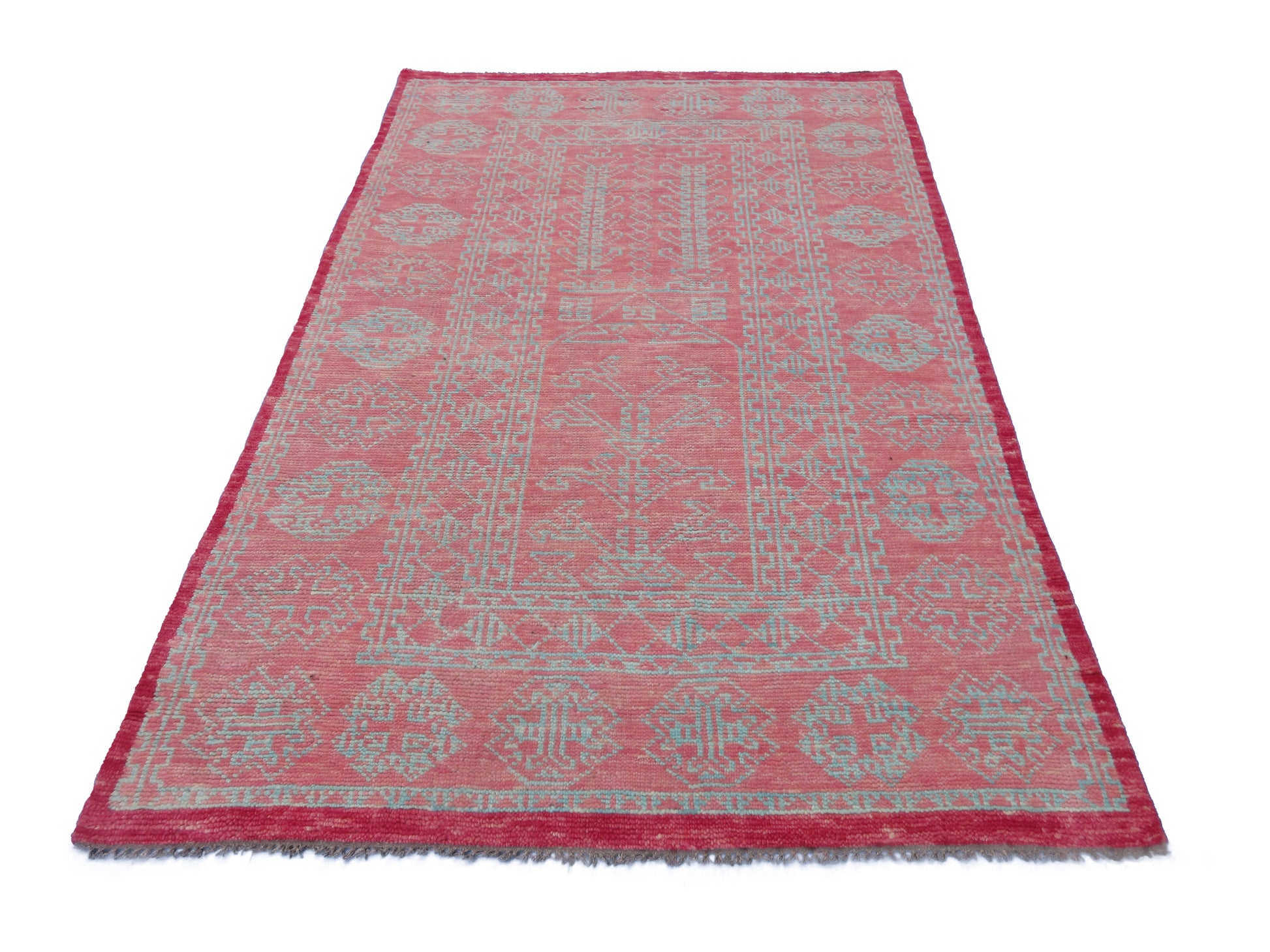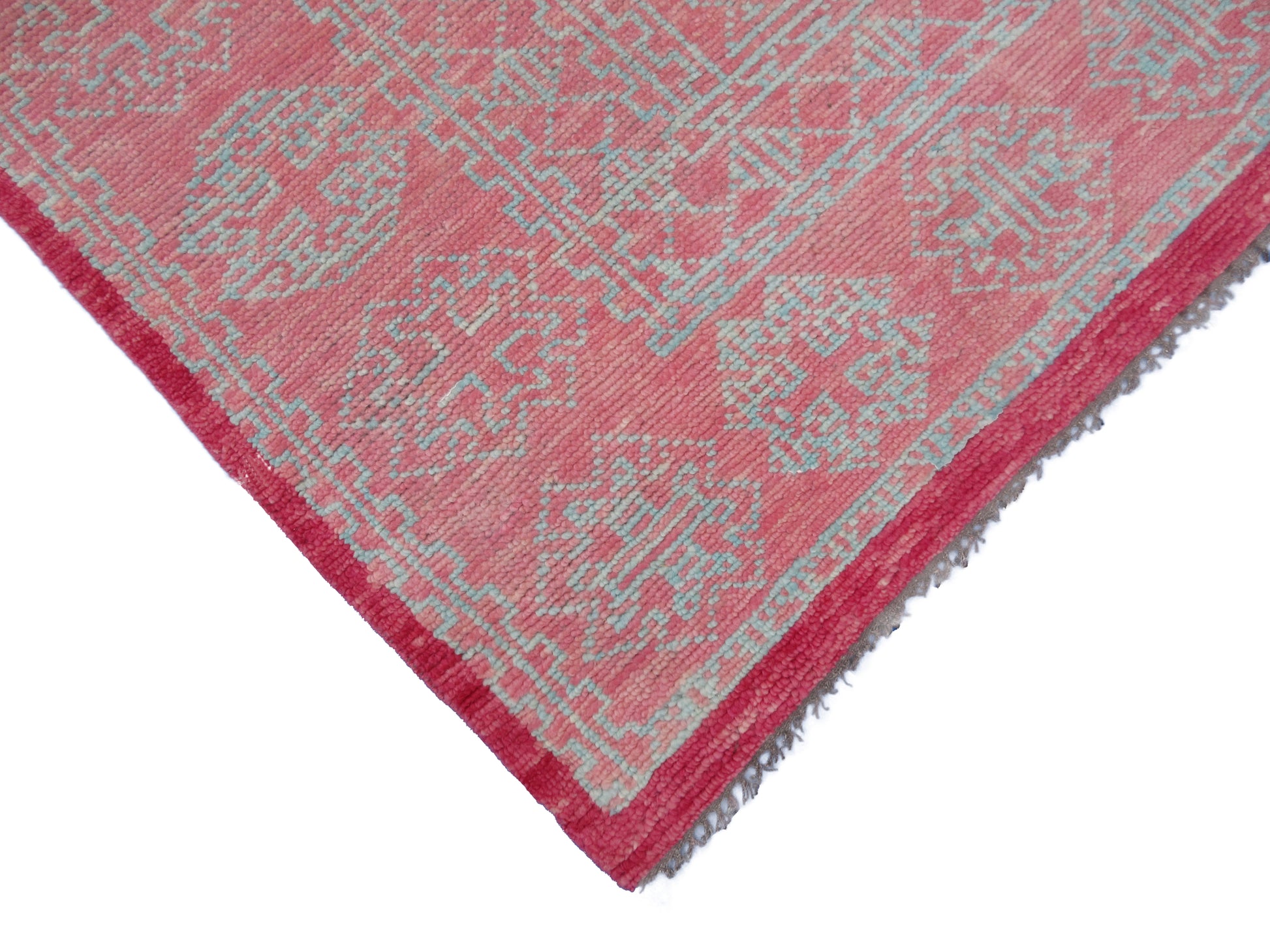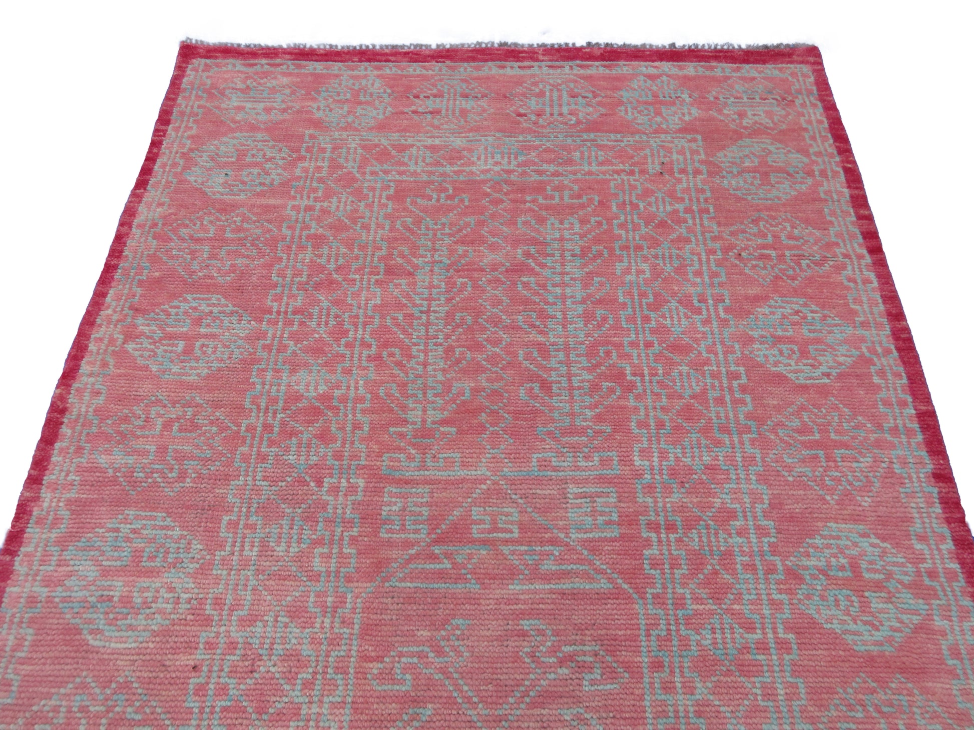 Transform your living space with this stunning handmade pure wool rug, measuring 8.0x5.2 feet. This hand-knotted rug features an intricate geometric tribal design in vibrant Pink. This rug is 100% hand-knotted by expert artisans from the village, ensuring that it is not machine-made. It is a stunning, eye-catching piece of floor art that will elevate the beauty of your living space. The intricate design, vibrant colour concept, high-quality materials, and traditional hand-weaving process combine to create a décor element that you'll cherish every time you see it.
