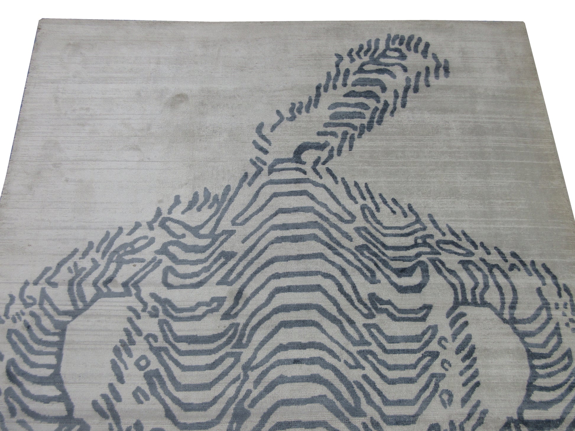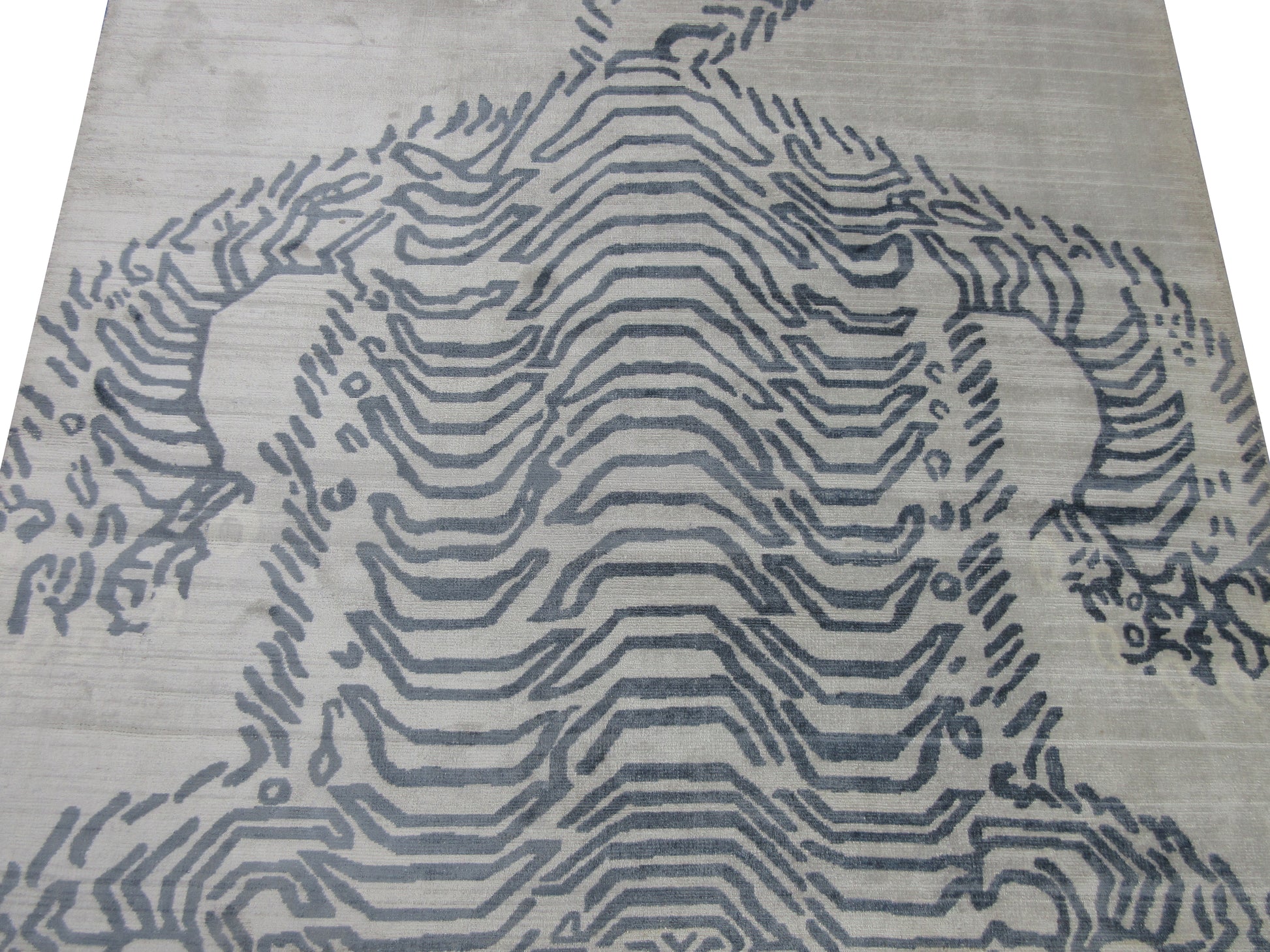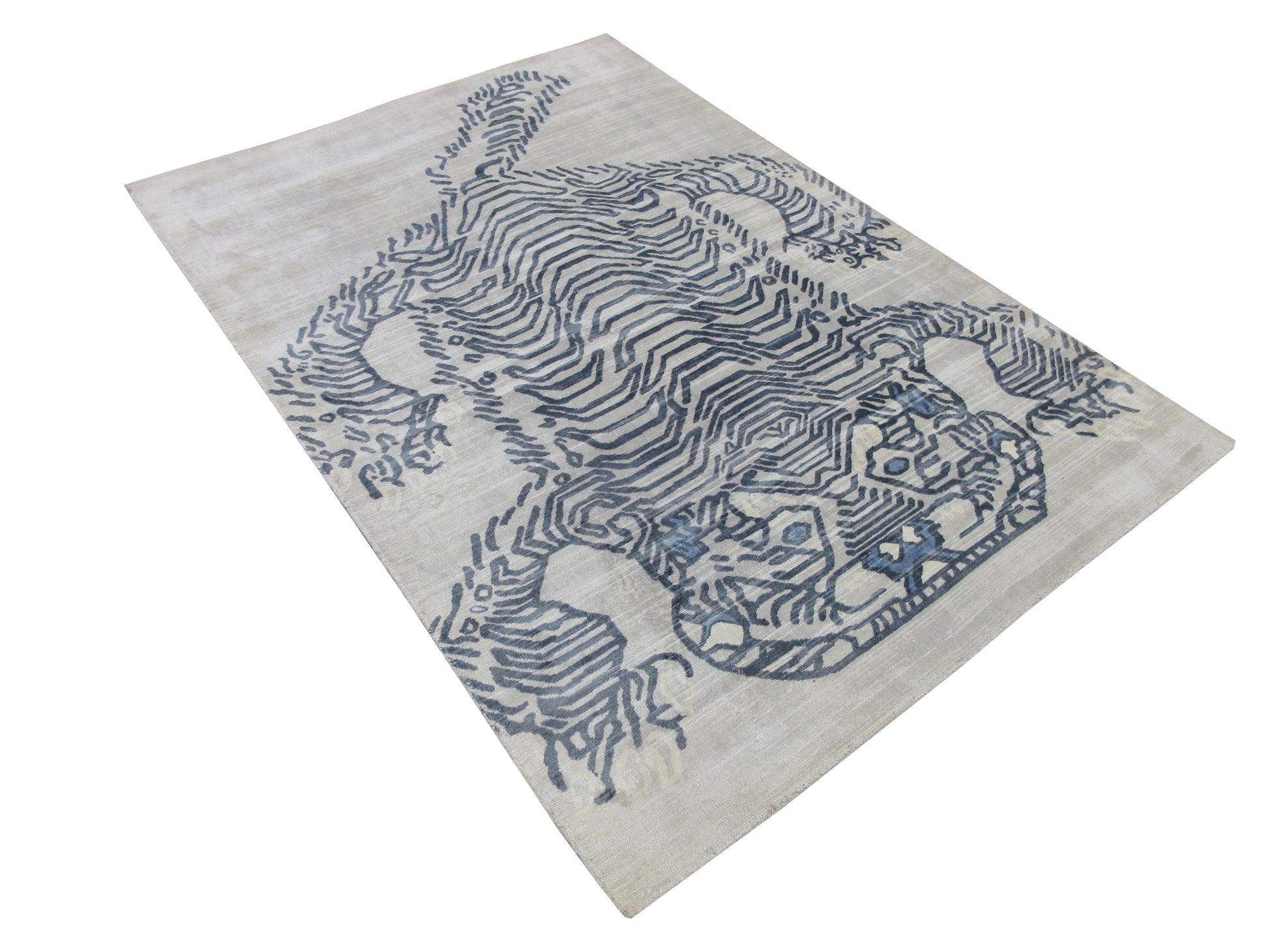 Handmade Silk Rug - 4.10X7.1 Feet Silver Abstract Tibetan Tiger Design Printed Area Rug