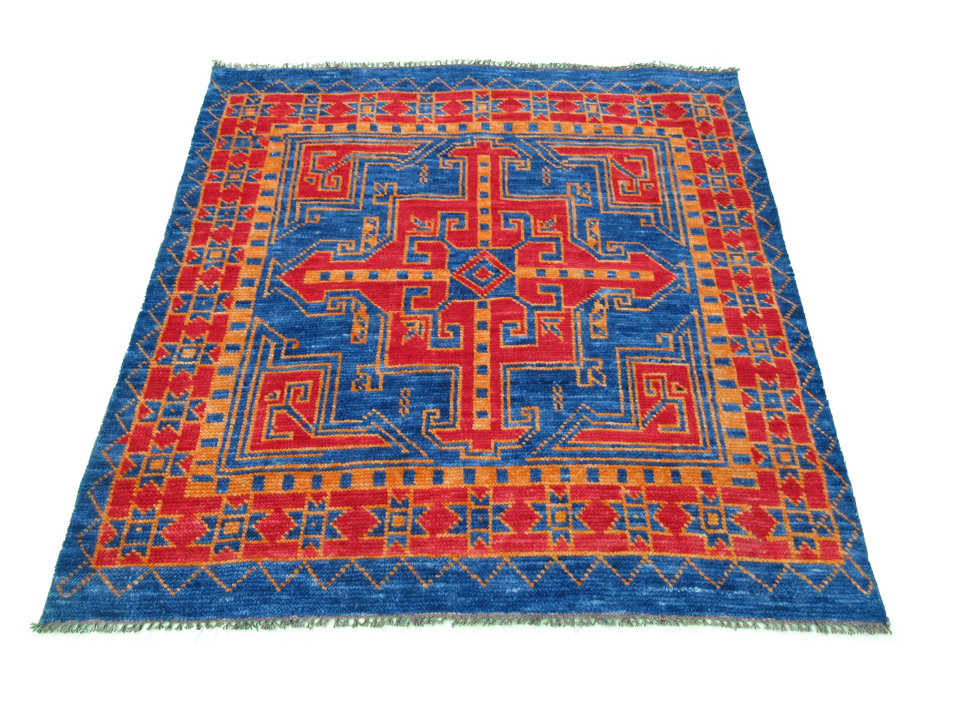 Handmade Tribal Design Rug - 5 x 5 Feet - Square Blue and Red Geometric Pattern